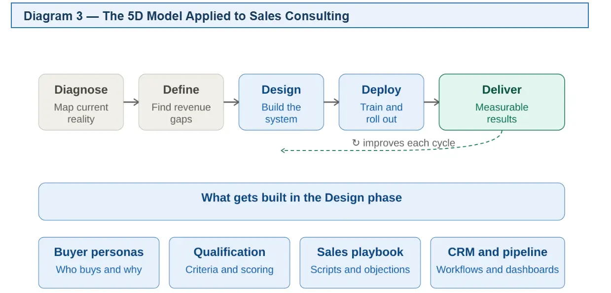 Every Sales Consulting engagement follows SmartStart’s proprietary 5D Model. Here is what each stage looks like specifically in the context of building your sales system.